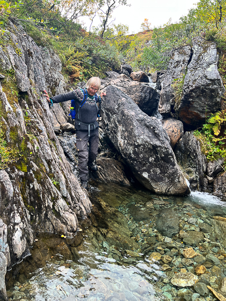 Straks nede. Solveig fortalte at når hun var jente kjørte faren innover hit med traktor og da gikk de opp dette berget.