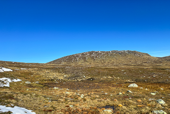Stien forsvant med tregrensa, så da var det bare å gå rett på det markante fjellet.