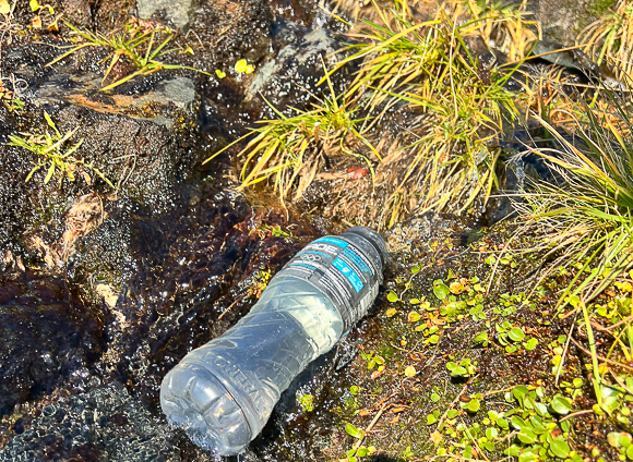 Fylte vannflaska på vei opp fjellsiden.