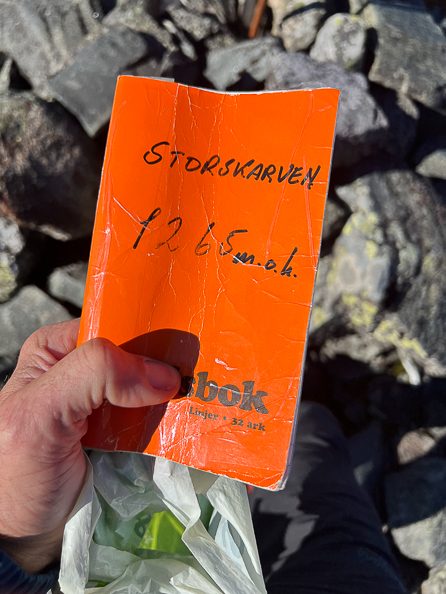 Her er jeg på toppen av Storskarven. Den er på 1265 moh og det er grensefjell mellom Røros og Holtålen. Jeg kom jo litt sent av gårde så jeg ville gå på litt oppover. Jeg brukte 2 timer og 10 minutt opp fra bommen (9,8 km).
