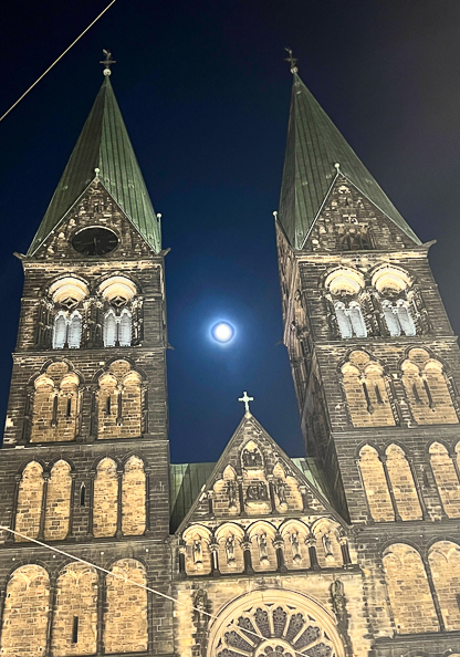 Fullmånen tok seg fint ut mellom tvillingtårnene på St. Peter's Cathedral.