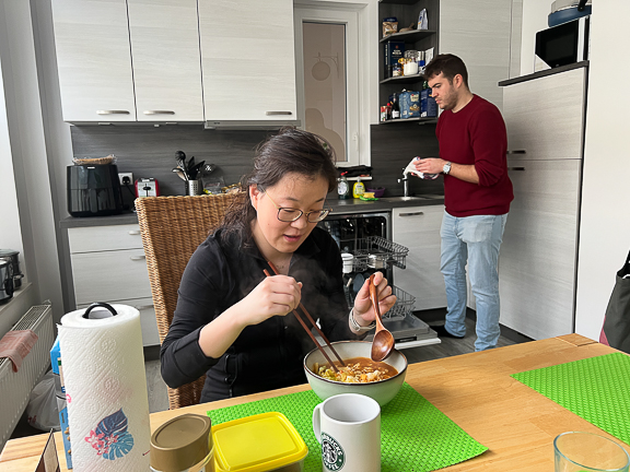 Yaping spiser før de kjører oss til flyplassen for å dra tilbake til Norge.