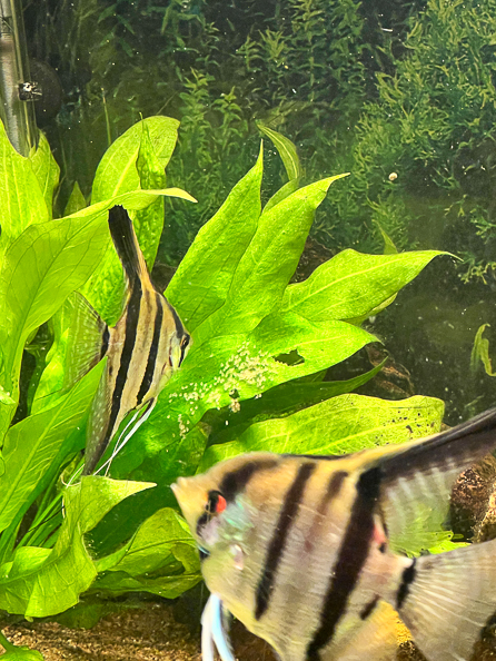 Mine 5 skalarer dannet par og la egg. De forsvarte de godt også, men så gikk det galt når de etter et par dager begynte å flytte de. Men det blir nok flere forsøk og de lærer nok for etterhvert.